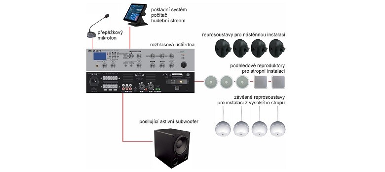 Dbáme na to, aby zvuk byl srozumitelný a líbivý. Efektní je, když je ozvučení nenápadné, a dostatečně výkonné. Na základě provedení prodejny se rozhodneme, zda reproduktory budou na stěnách, nebo na stropě. V případě nástěnného provedení, volíme Dexon SP 512 s konzolou. V případě stropní vestavné instalace volíme Dexon RPT 110 nebo RPT 122. Jejich zvuk je výborný. Jde-li o otevřený strop, často v supermarketech, používají se závěsné reprosoustavy. Nesmí být ale příliš vysoko, nesmí být malé a musí být kvalitní. Zde jednoznačně volíme Dexon RPT 122Z (špička v závěsných reprosoustavách), nebo přinejmenším RPT 90Z.